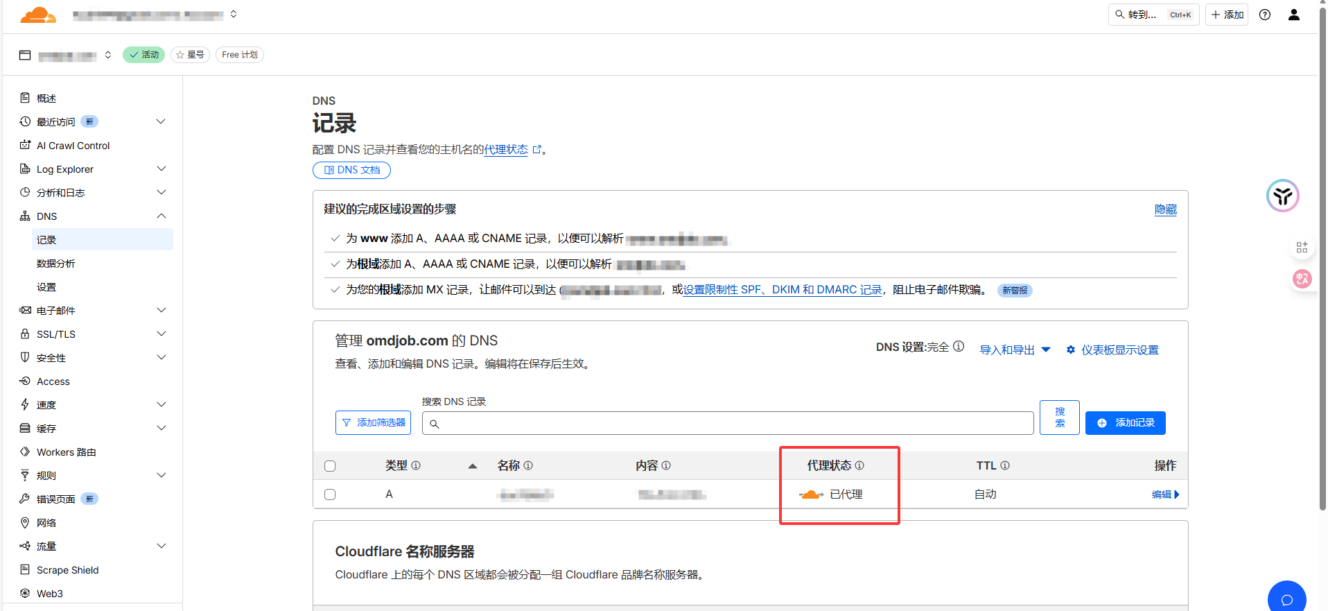 这一部分就不截图了,把DNS解析商的地址缓存cf提供的,把域名托管过来就行